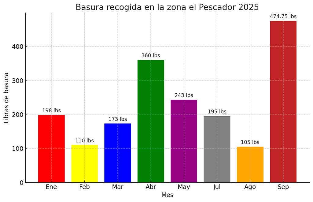 El sábado 20 de julio, se llevó a cabo la minga de control mensual con la entusiasta participación de 25 voluntarios. Este esfuerzo colectivo logró retirar 129 libras de basura, una cifra notablemente menor en comparación con jornadas anteriores, lo que refleja el impacto positivo de nuestras charlas educativas.