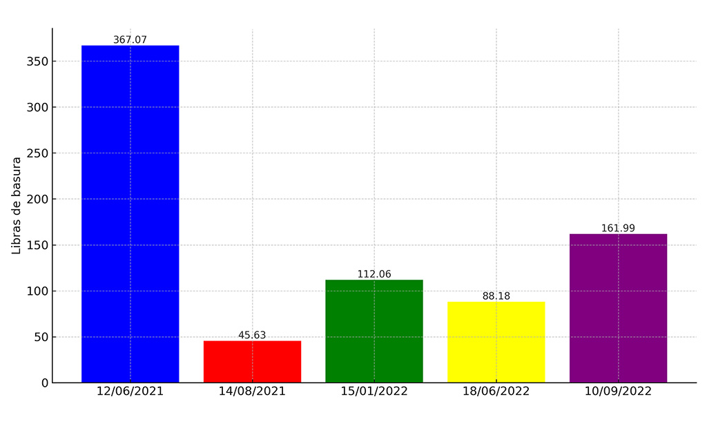 Durante la jornada recolectamos 474.75 libras de residuos, además de dos llantas y una bicicleta. Como es habitual, se mantuvo el promedio de 5 libras de basura por voluntario, un indicador que refuerza la consistencia de nuestros datos y la efectividad del programa.